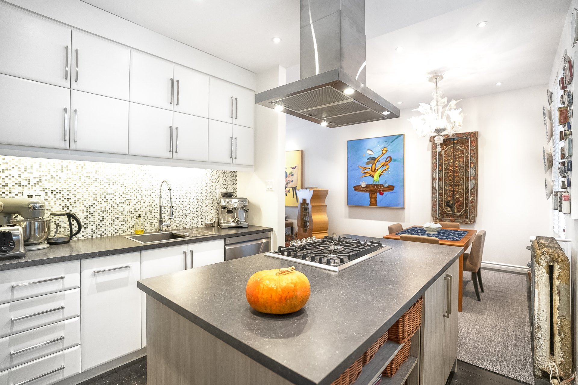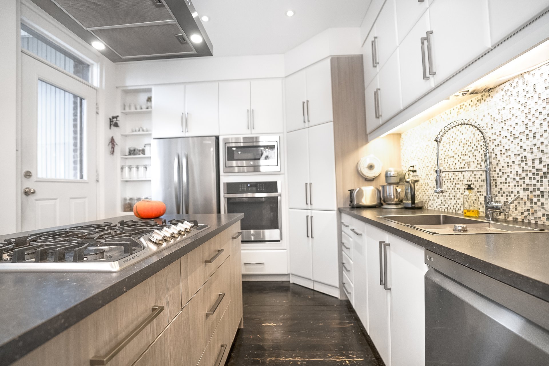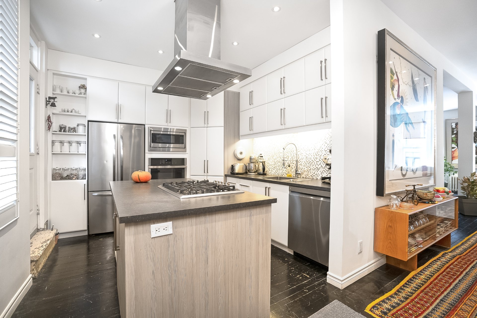 réfrigérateur, hotte, four encastré, lave-vaisselle, micro-onde, laveuse, bibliothèque du rdc, lustre rdc, luminaires, meuble gris du pallier formant un garde fou